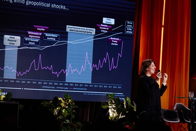A person on stage presents a slide showing "Europe 55%" with a bar chart, in a dimly lit auditorium with an audience.