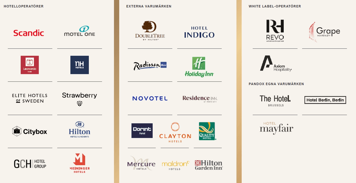 Helt avgörande för Pandox framgång är de samarbeten som bolaget har med sina hyresgäster, vilka består av ett 40 hotelloperatörer och hotellvarumärken med olika karaktär och geografisk räckvidd. Det är globala varumärken som Hilton, regionala varumärken som Scandic och lokala oberoende varumärken som Hotel Berlin, Berlin.